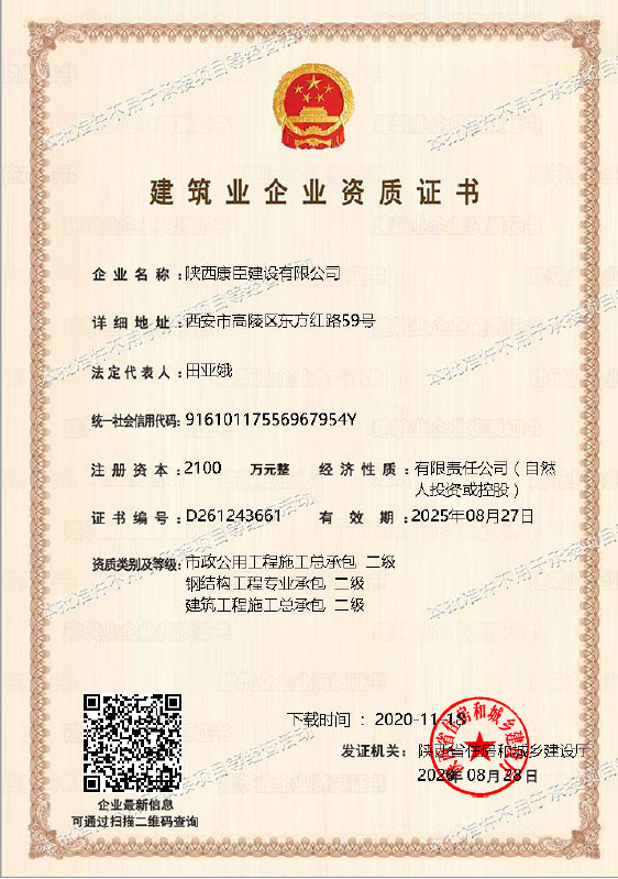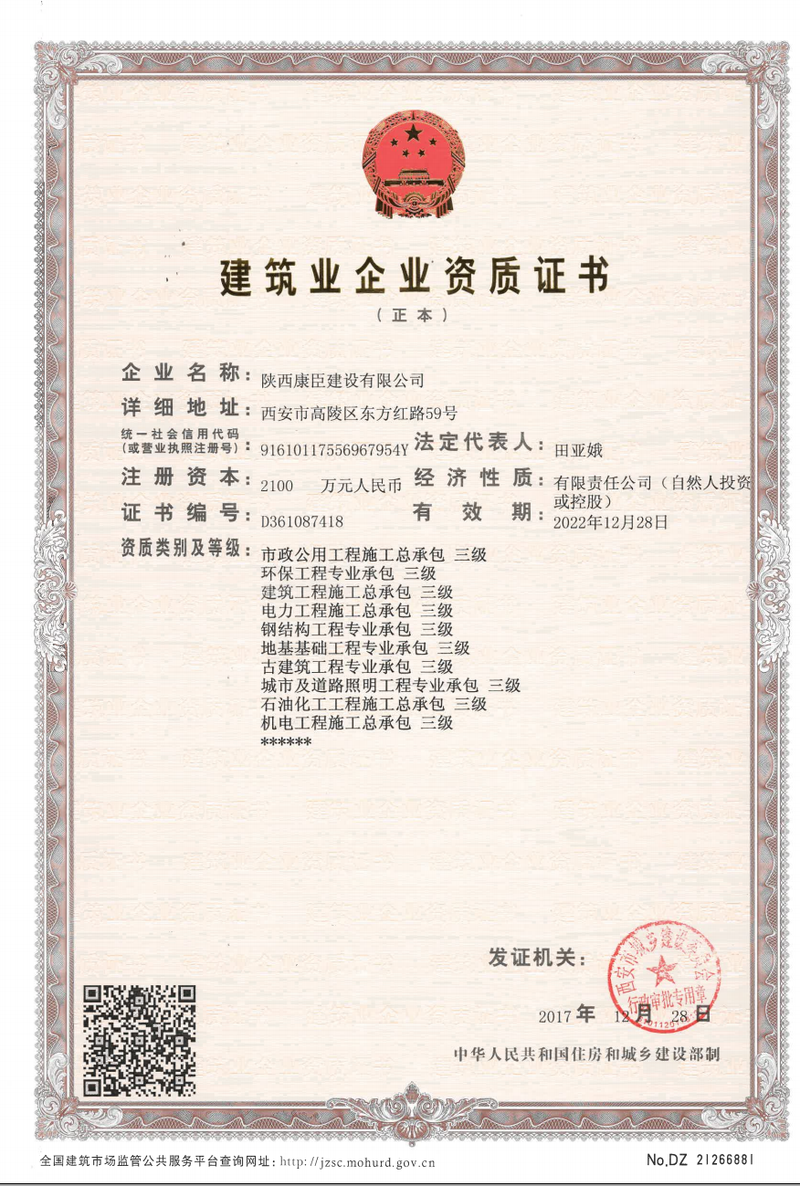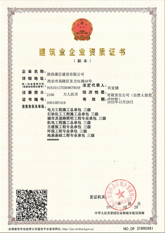 陜西康臣建設有限公司(簡稱康臣建設)始建于2010年6月,注冊資金2100萬元整。公司是從事市政公用工程、房屋建筑工程、城市及道路照明工程、電力工程、石油化工工程為主的企業,具有建筑工程施工總承包二級、市政公用工程施工總承包二級、鋼結構工程施工專業承包二級、城市及道路照明工程專業承包、電力工程施工總承包、石油化工工程施工總承包、環保工程專業承包、機電工程施工總承包、地基基礎工程專業...more+